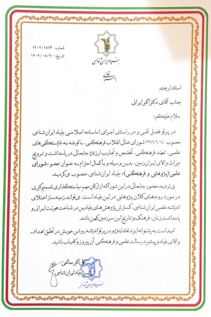 علیاکبر صالحی، رئیس بنیاد ایرانشناسی طی حکمی اکبر ایرانی را به عنوان عضو شورای علمی این بنیاد منصوب کرد.