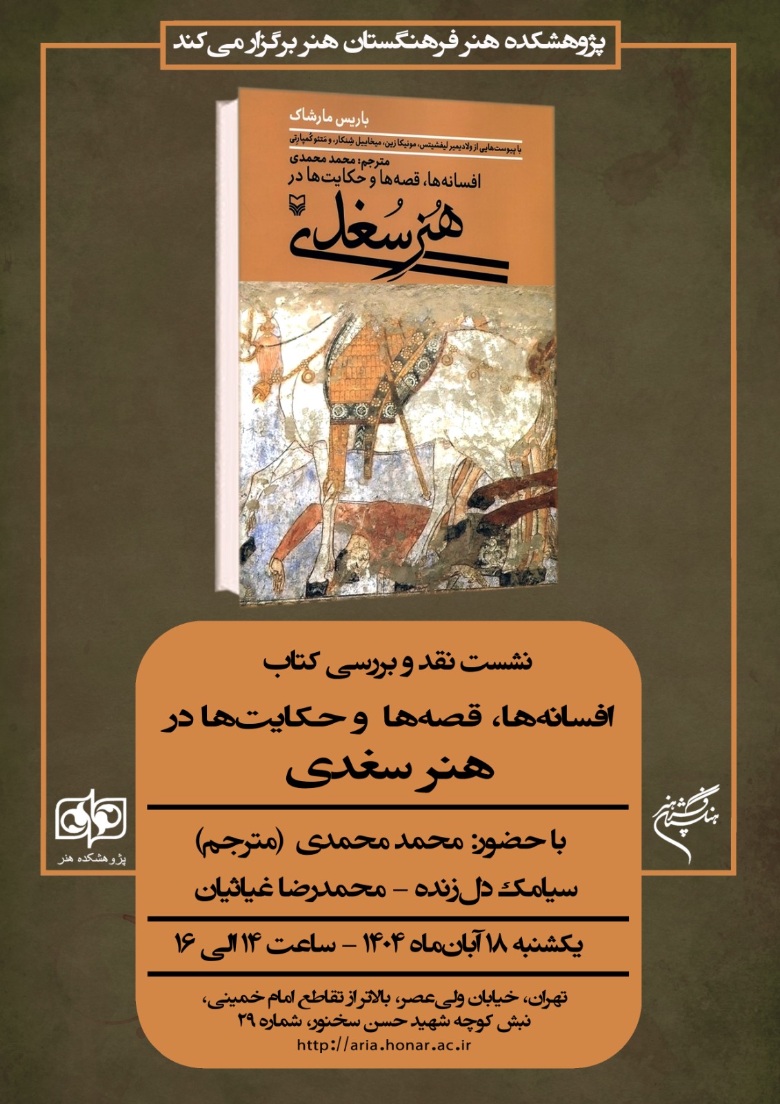 نشست نقد و بررسی کتاب «افسانهها، قصهها و حکایتها در هنر سغدی»، یکشنبه ۱۸ آبانماه ۱۴۰۴، از ساعت ۱۴تا ۱۶ در محل پژوهشکده هنر به نشانی تهران، خیابان ولیعصر، بالاتر از خیابان امام خمینی(ره)، نبش کوچه شهید حسن سخنور، پلاک ۲۹، برگزار میشود.