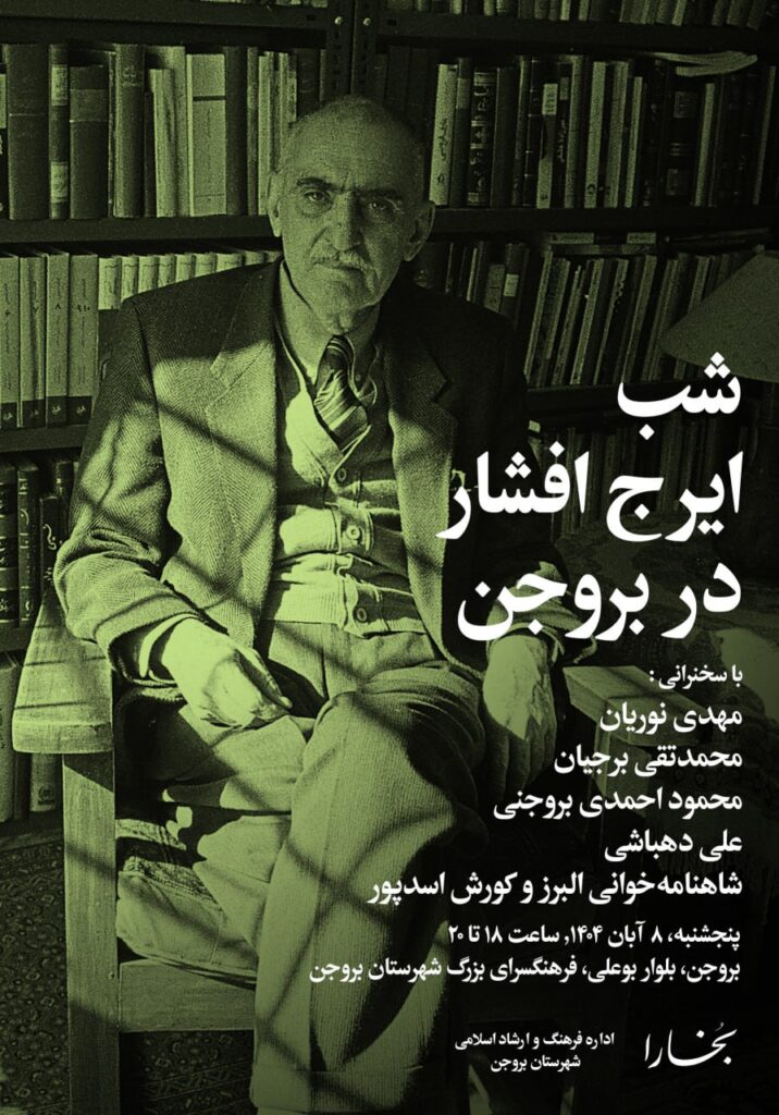 پس از برگزاری نشست «گلگشت در وطن» (سفرنامچۀ ایرج افشار) از مجموعه نشست‌های «سفرنامه‌خوانی با مهدی گوهری» در عصر شنبه پنجم مهرماه ۱۴۰۴، اینک مجلۀ بخارا به مناسبت یکصدمین سالروز تولد استاد ایرج افشار، نهصد و یکمین شب بخارا را در شهر بروجن برگزار می‌کند. این نشست در ساعت شش عصر پنجشنبه هشتم آبان‌ماه ۱۴۰۴ با سخنرانی مهدی نوریان، محمدتقی برجیان، محمود احمدی بروجنی و علی دهباشی در فرهنگسرای بزرگ شهر بروجن برگزار خواهد شد. شاهنامه‌خوانی توسط البرز و کورش اسدپور و پخش فیلم مستند «فرزانۀ فروتن ایران‌مدار ما» به کارگردانی سیدجواد میرهاشمی از دیگر بخش‌های این نشست خواهد بود.