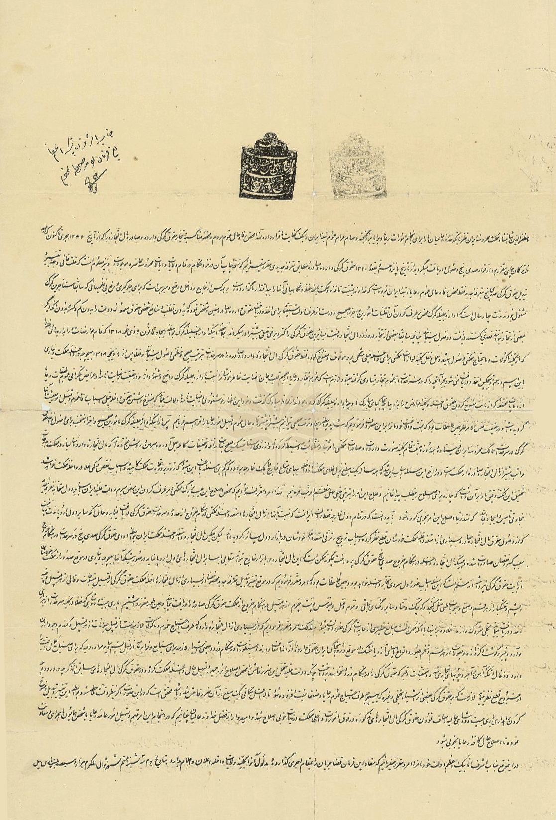 در متن سند، دستخط شاه برای تأیید اجرا خطاب به اتابک اعظم درج شده و نقش مهر سلطنتی نیز بر فرمان آمده است.