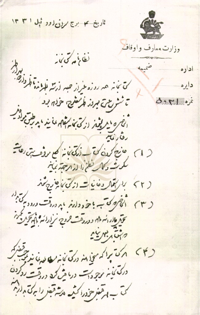 سند تازه ارائه‌شده در این شماره، گوشه‌ای از نخستین تلاش‌های اداری ایران برای تنظیم مقررات کتابخانه‌های عمومی در سال‌های پایانی دورۀ قاجار را نشان می‌دهد.