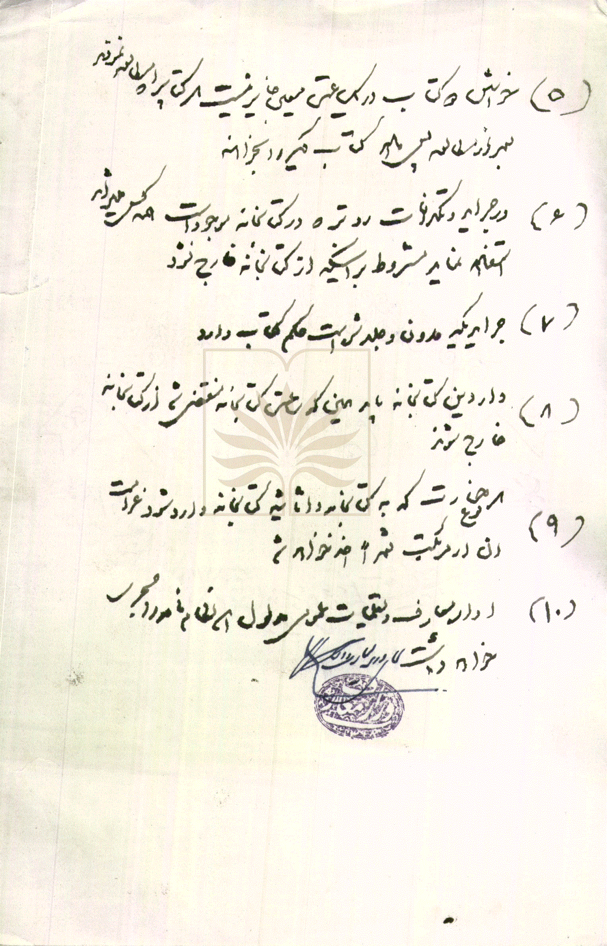 در پایان سند، مهر و امضای مقام مسئول وقت دیده می‌شود که نشان‌دهندۀ توجه دستگاه معارف به جایگاه کتاب و نقش کتابخانه در زندگی فرهنگی جامعه است. این سند با شماره ثبت ۳۶۴۶۳–۲۹۷ در آرشیو ملی ایران نگهداری می‌شود.