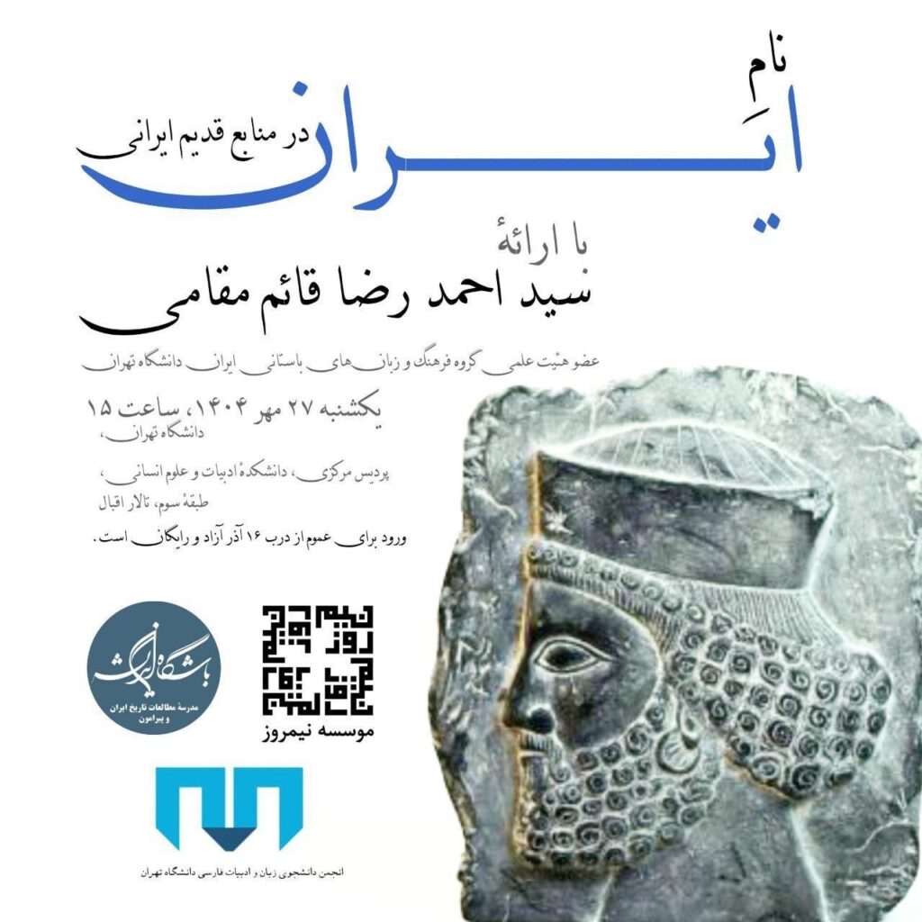 نشست «نام ایران در منابع قدیم ایرانی» یکشنبه ۲۷ مهرماه ۱۴۰۴، ساعت ۱۵ تا ۱۷ در دانشگاه تهران، دانشکده ادبیات و علوم انسانی، طبقه سوم، تالار استاد عباس اقبال آشتیانی برگزار میشود.